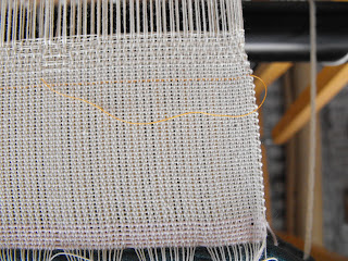 I noticed that when I was weaving with the 2/16 cotton that I had large loops on the edges. In the picture you can see that the tension is fine with the 2/8 pink scrap cotton but the 2/16 is too loose.
