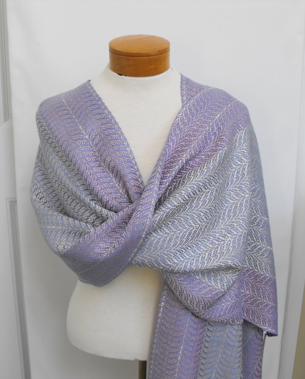 I almost forgot to show you the beauty photos of the 8 Shaft Frond pattern shawl that I took off the loom last month. This shawl turned out just wonderfully light and supple; and since I’m a bit of a magpie and drawn to shiny things, it fills that role too.